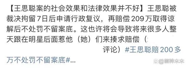 对于这种情况,也有专业律师发文表示,如果网传属实的话,王思聪确实赔偿了 209 万并且不会受到任何惩罚,那么由此带来的社会效果和法律效果并不理想,该律师认为此案可能会导致很多人将此作为生财之路。