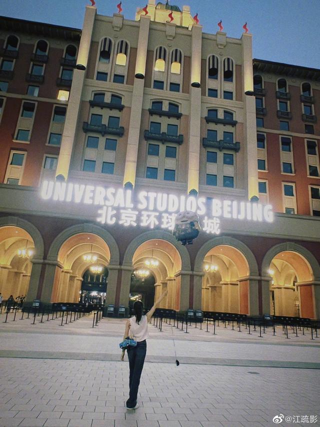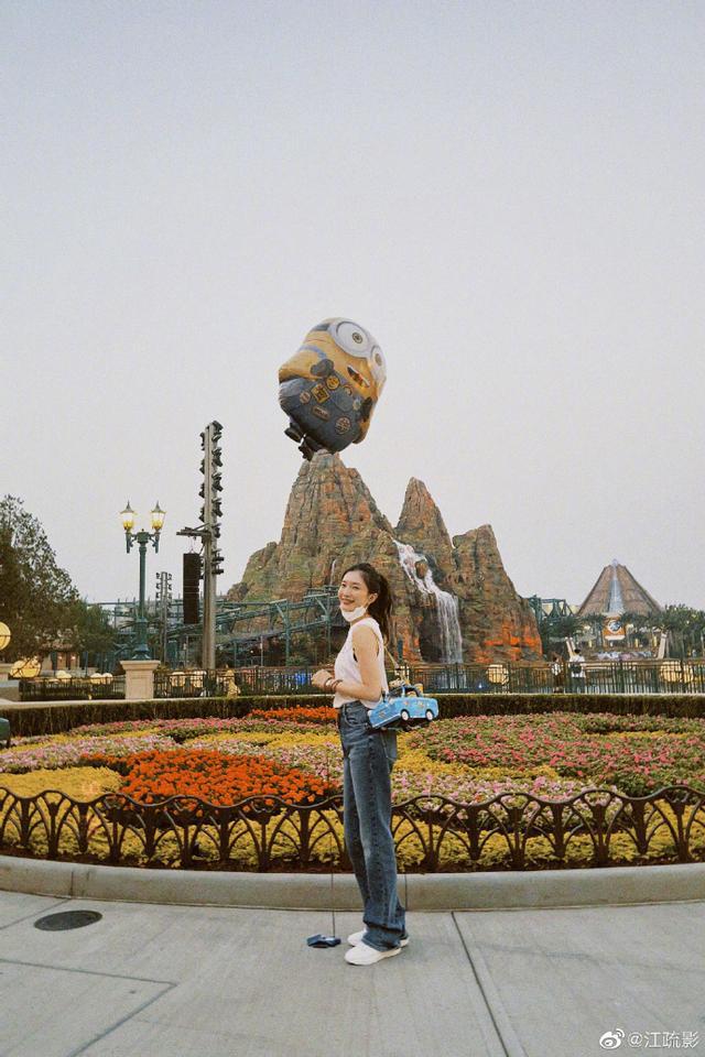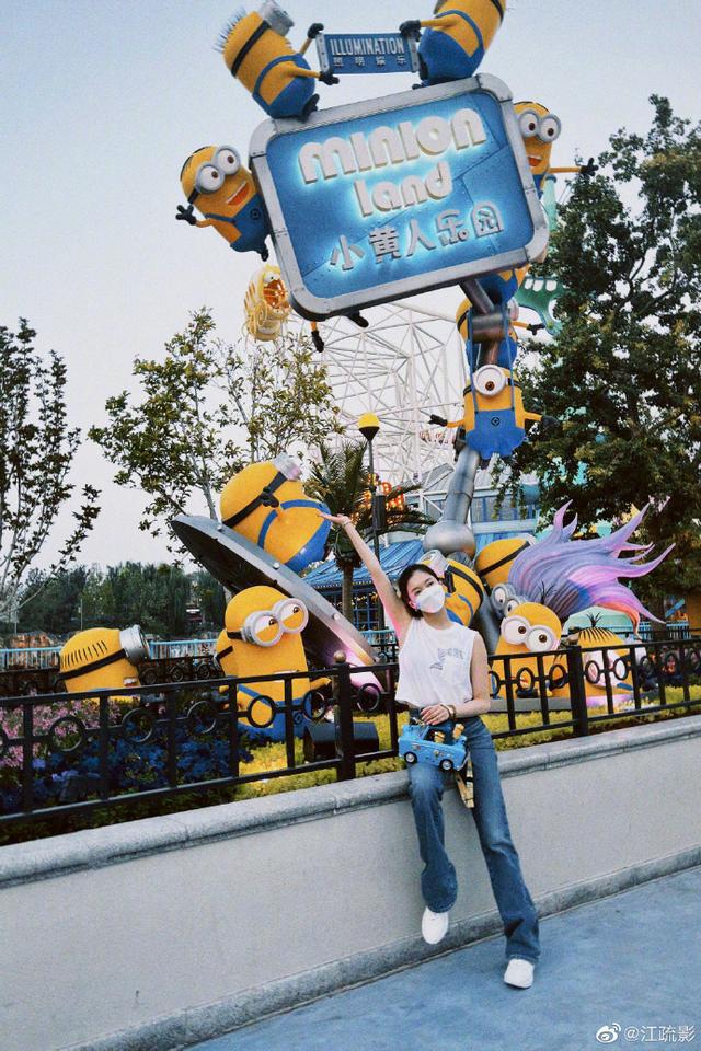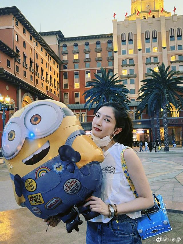 新浪娱乐讯 10 日,江疏影晒出环球影城游玩 plog,穿白色背心牛仔裤戴口罩低调与小黄人开心合影,童心满满。