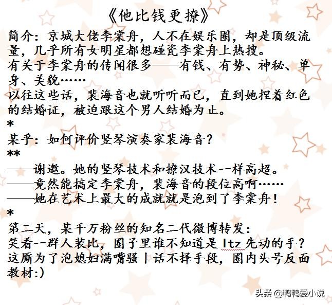 娱乐圈隐婚甜宠文:《他比钱更撩》《影帝的隐婚妻子》