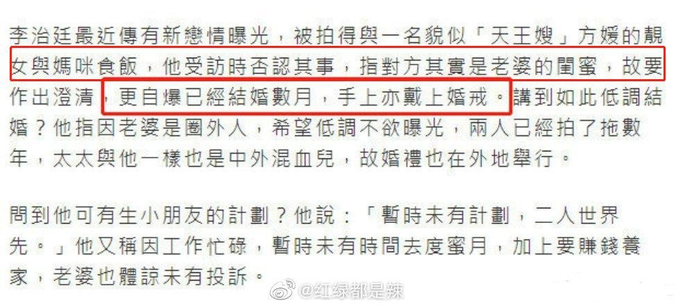 李治廷称与老婆交往数年,细数一下也就是他之前公开官宣过的混血女友。2019年,李治廷被拍到与女友聚餐,席间两人拥吻,恋情曝光,随后他公开恋情,称自己是女方初恋,希望大家多给空间。他还提到女方不是圈内人,希望不要对她进行多余评论。