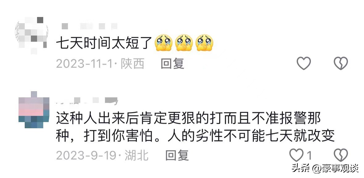 对于这件事,该丈夫自然是受到了应有的惩罚,该丈夫被拘留七日。但网友表示七天的时间太短,该丈夫根本不会认识到自己的错误。