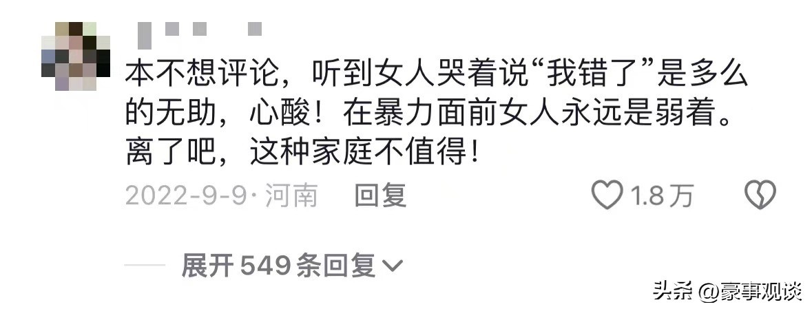 有网友表示:本来不想评论的,听到女人哭着说“我错了”,是多么的无助、心酸,在暴力面前女人永远是弱者,这种家庭不值得。