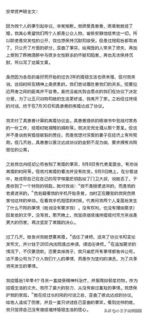 在具惠善晒出的两人聊天记录中,安宰贤拒绝见面讨论离婚事宜,也拒绝等具惠善的母亲病好之后再商量离婚的事情,而是想着不能影响他当时正在参加的综艺节目《新西游记》,下周就由媒体发布他授权的协议书和离婚说明。