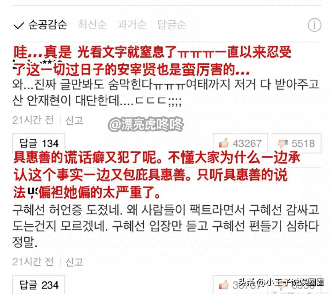 虽然安宰贤的声明发得早,但是让人认为是准备了两三天才憋出来的,而具惠善的声明则是看到安宰贤的声明后用了一个小时写出来的,而且细节和语言都更丰富,极具感染力,所以大家几乎都是站在具惠善一边,声讨安宰贤的不负责任、狼心狗肺。