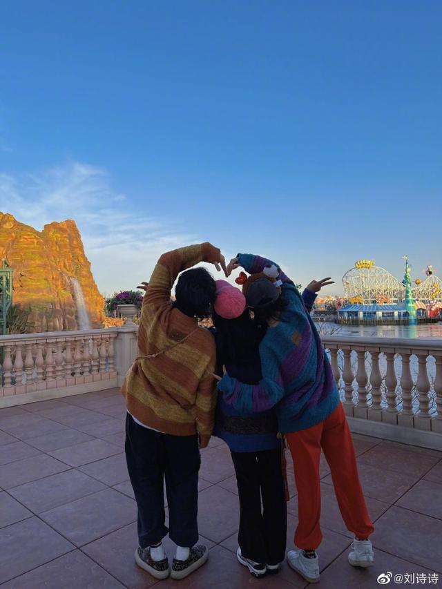 新浪娱乐讯 15 日,刘诗诗晒出一组环球影城游玩照,她和好朋友们比心合影,开心自在。