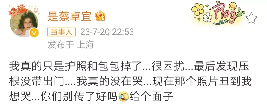 关于照片,蔡卓宜解释道:“我真的只是护照和包包掉了,很困扰。”等缓过神来,才发现自己根本没有带出门。