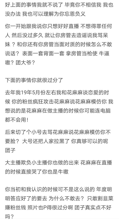 近日,有一位ID“河飘飘”的人在呆妹儿鱼吧爆出不少小团团的料,据他自己描述曾是小团团昔日双排的队友,直指小团团忘恩负义,随后河飘飘还发布了一张疑似小团团的照片,于是双方粉丝之间的骂战也愈演愈烈。