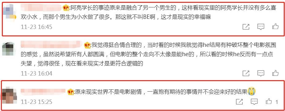 另外一位网友则表示:“阿亮学长的事迹原来是融合了另一个男生的,这样看现实里的阿亮学长并没有多么喜欢小水,而那个男生为小水做了很多。那这就不叫BE啊,这才是现实的幸福嘛”。