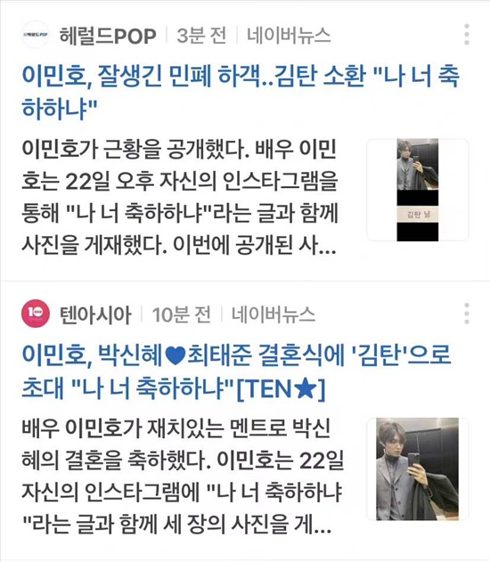 婚礼当天下午两点左右,成功避开现场媒体的李敏镐,在社交网发布了自拍照,照片中的他身穿灰色西装,明显就是去参加朴信惠的婚宴。