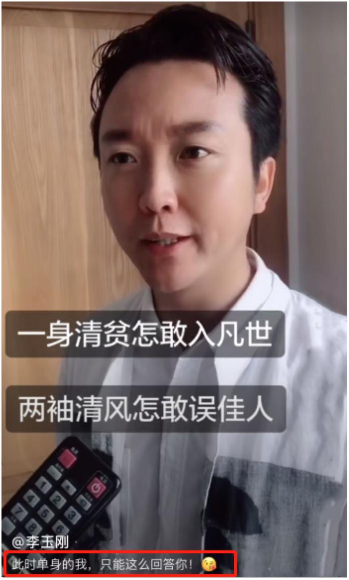 而本质上,李玉刚是在直接回应那些对自己感情妄加谣言的散播者,李玉刚还在下面配文表示道,此时单身的我,只能这么回答你。