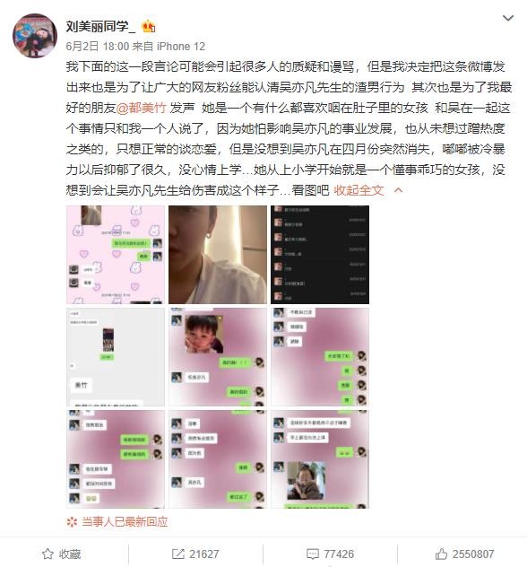 其实在6月2日就有网友爆料称吴亦凡与18岁女学生谈恋爱,随后又有多位女生晒出与吴亦凡的“聊天记录”甚至还与人晒出了吴亦凡的照片。随后吴亦凡的工作室在6月3日就此事做出回应称:将起诉恶意造谣者。