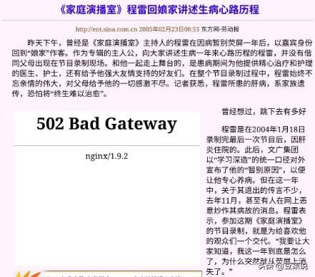 信息来源:东方网2005.2.23——《家庭演播室》程雷回娘家讲述生病心路历程