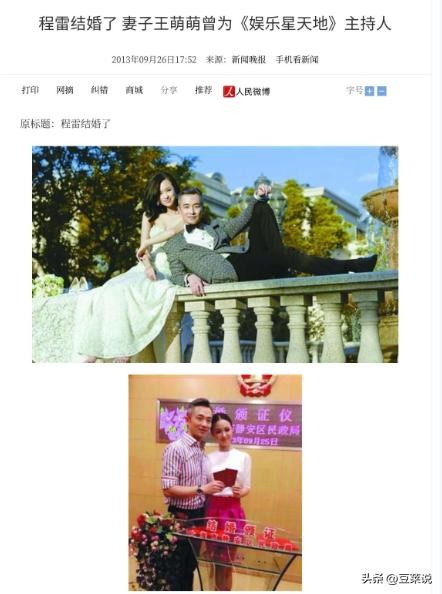 信息来源:新闻晚报2013.9.26——程雷结婚了妻子王萌萌曾为《娱乐星天地》主持人