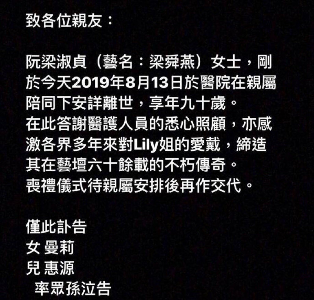 其孙儿在社交网络发出讣告,感激各界多年来对梁舜燕的爱戴,缔造其在艺坛60余载的不朽传奇。