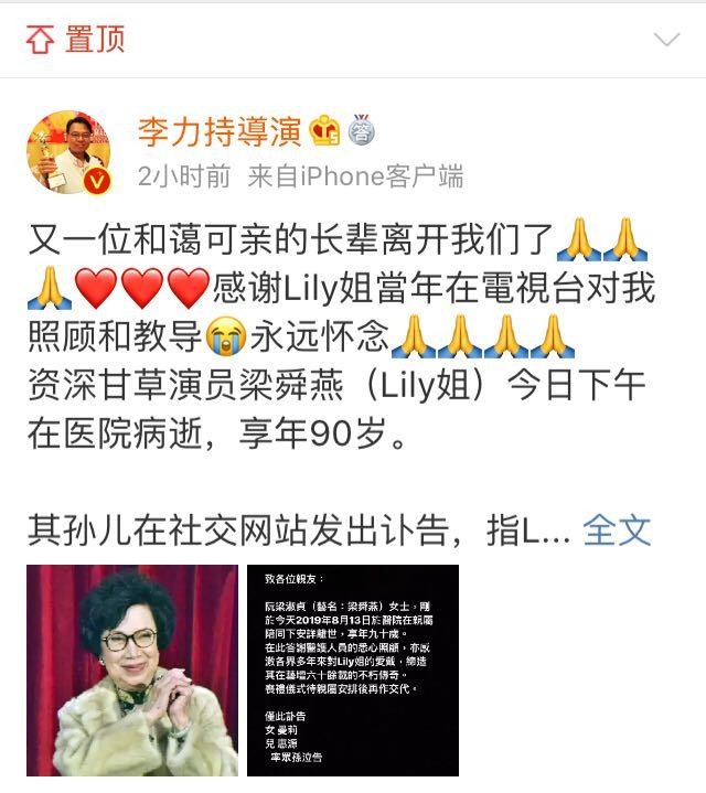 李克勤和李力持导演也在微博发文悼念梁舜燕的病逝。