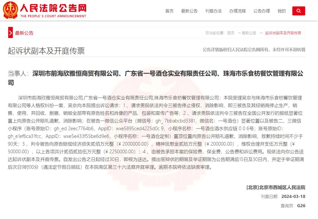 据人民法院公告网,近日,北京互联网法院公告送达吴京与深圳市前海欣雅恒商贸有限公司、广东省一号酒仓实业有限责任公司、珠海市乐食枋餐饮管理有限公司人格权纠纷起诉状副本及开庭传票等。