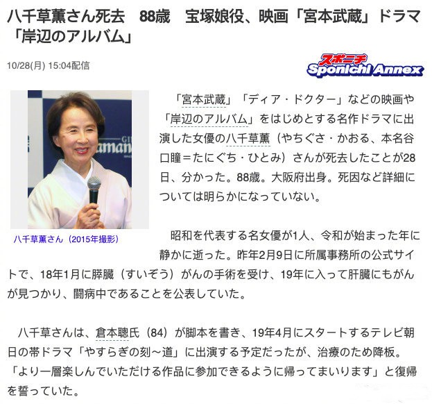 据日媒报道,日本著名女演员八千草薫于28日确认去世,享年88岁。