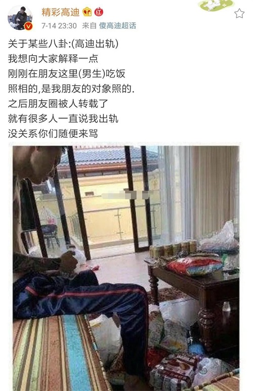 大美昨晚直播哭诉爆料高迪出轨照片,晚间高迪发博澄清传闻称,在哥们家里吃饭照相的,是我朋友的对象照的,之后朋友圈被人转载了,就有很多人一直说我出轨,没关系你们随便来骂。让大家又虚惊一场