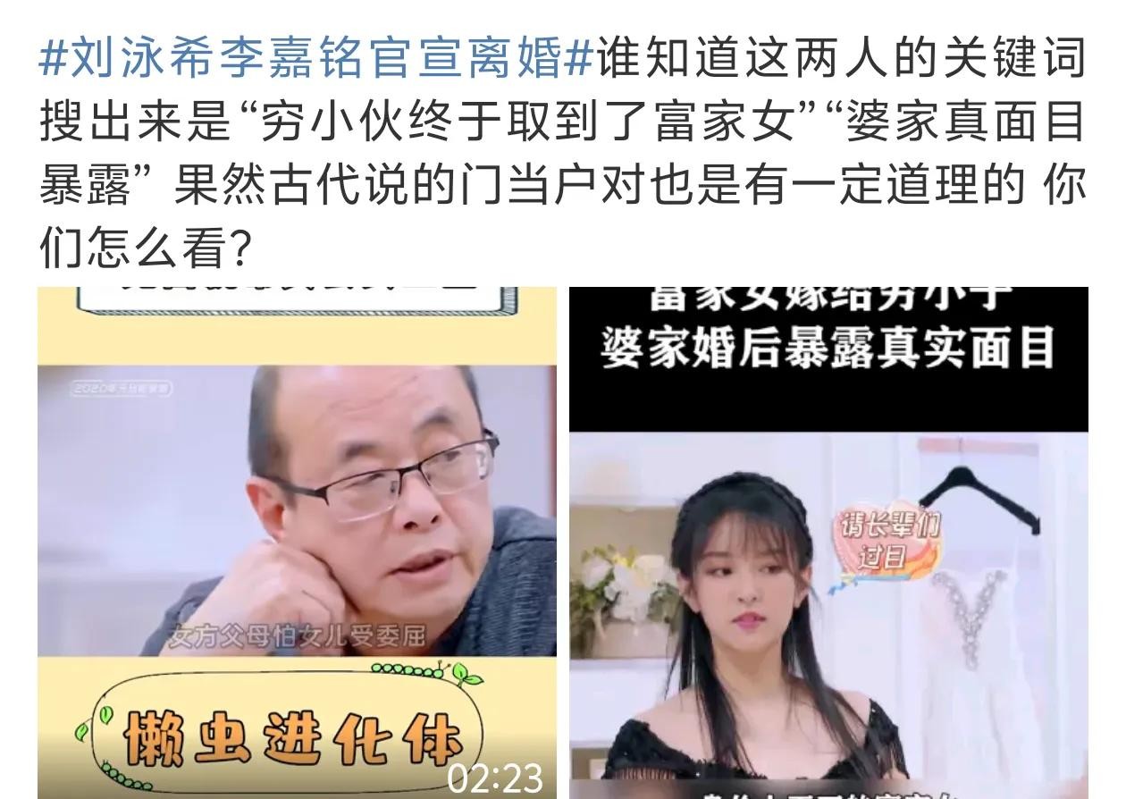 今年是内娱离婚年啊?昨天陈晓陈妍希才官宣离婚,今天刘泳希李嘉铭也官宣离婚了。说起他们两个名字是不熟悉,但是说穷小子娶到了富家女、娶到后婆家真面目暴露那就太熟悉了