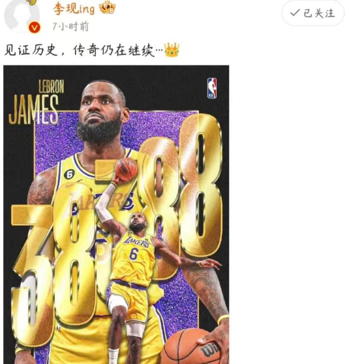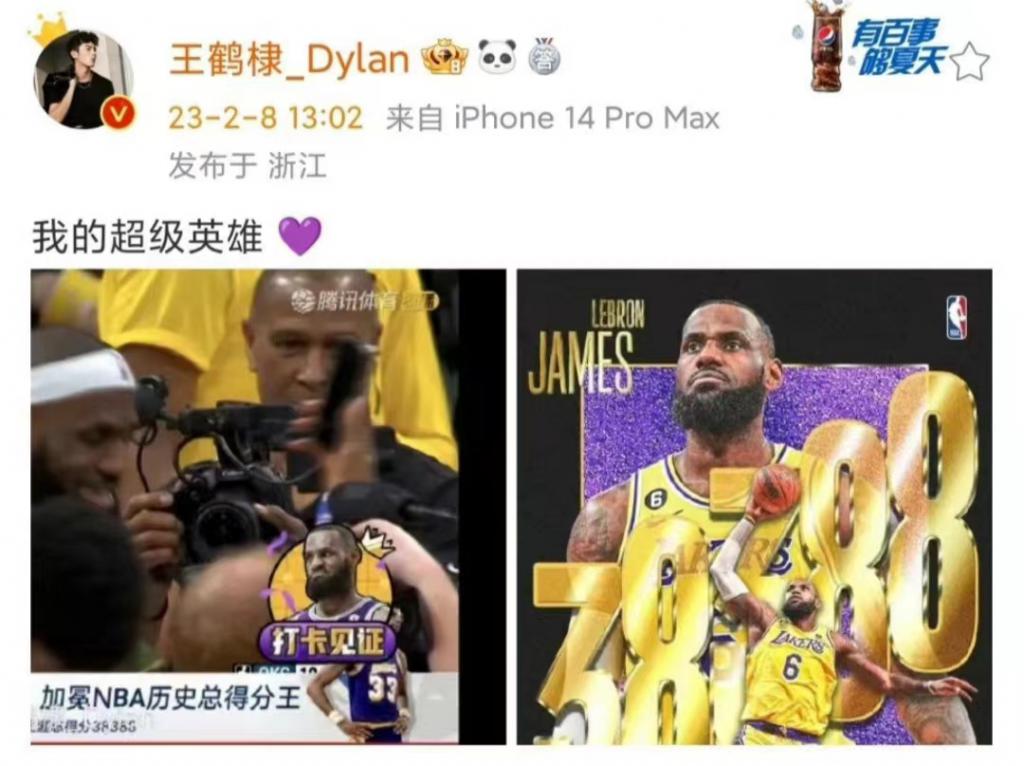 2 月 8 日,王鹤棣发微博恭喜詹姆斯成功加冕 NBA 历史总得分王。