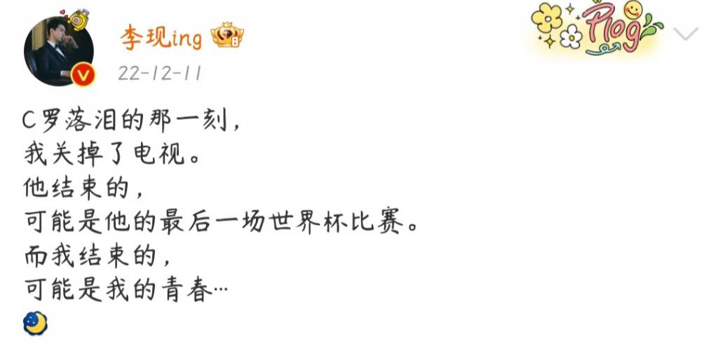 但是李现和王鹤棣还有些不同,李现还喜欢着足球明星 C 罗,今年世界杯期间连续多次发微博为 C 罗摇旗呐喊,感叹随着 C 罗最后一场世界杯结束,自己的青春也结束了。