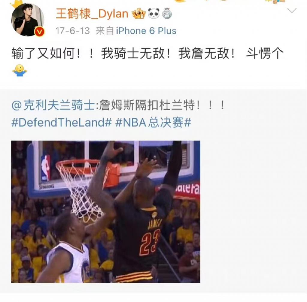 2017 年,在詹姆斯输了比赛时,王鹤棣还发了微博 " 输了又如何!!我骑士无敌!我詹无敌!斗楞个 " 甚至带上了自己的家乡话。