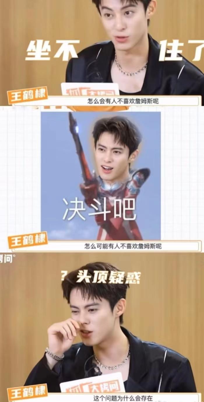 之后在一次采访中,王鹤棣被问到关于詹姆斯的问题时,直接三连反问 " 怎么会有人不喜欢詹姆斯呢?怎么可能不喜欢詹姆斯呢?这个问题怎么会存在?" 大大的眼睛里充满了疑惑。确实能感受到王鹤棣对詹姆斯的爱。