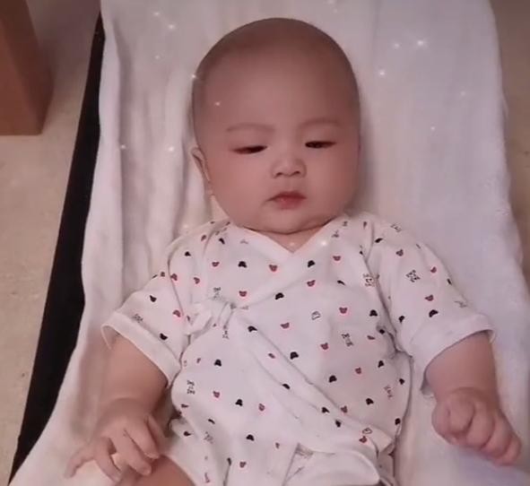照片中的小儿子头上没有任何头发,身上肉嘟嘟的,看起来特别可爱。