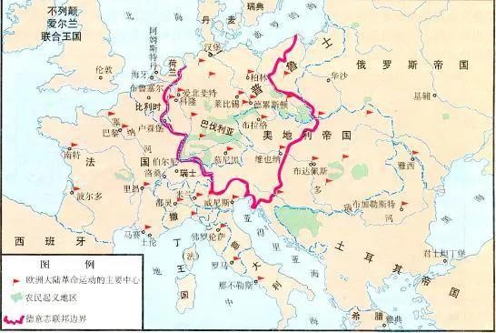 拿破仑倒台后,于1815召开“维也纳会议”成立德意志联邦,这个邦联由德意志34个邦和4个自由市(汉堡、不来梅、卢卑克和美因河上的法兰克福)组成,在法兰克福设立联邦议会,奥地利为主席代表主持邦联会议,普鲁士为副主席。这个邦联是一个不折不扣的松弛的政治联盟,各邦享有独立的主权。因此,德意志继续保持分裂的局面。