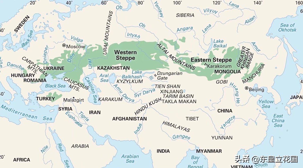 接下来我用一种简单表达方式让大家容易理解,那得先说欧亚大草原。欧亚大草原东起中国东北,西至匈牙利平原。对于生活在草原上的游牧民族如匈奴、突厥、蒙古等是一条畅通无阻的道路。