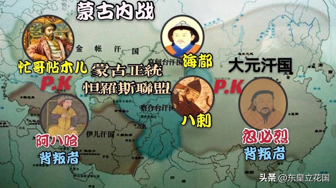 1269年,海都在忙哥帖木儿支持下建立窝阔台汗国,然后金帐汗国、察合台汗国、窝阔台汗国三国在中亚怛罗斯城会盟。三大汗国瓜分中亚,并坚决拥护蒙古传统,相当于将忽必烈和伊尔汗国从黄金家族正统当中给开除出去。