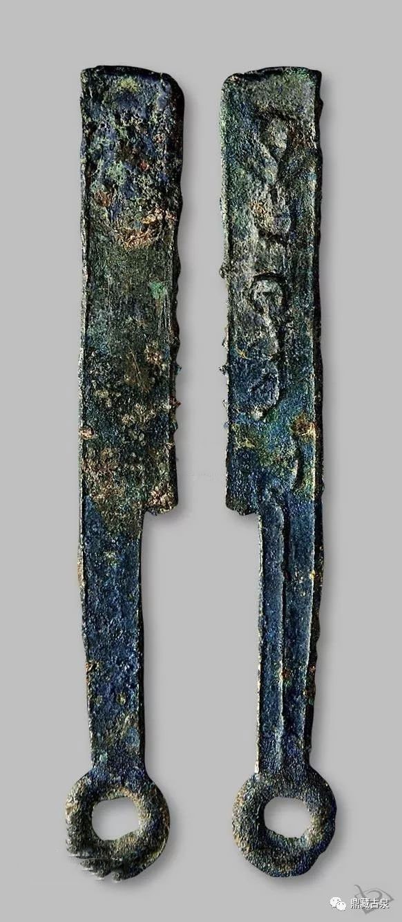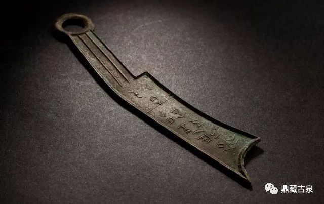 4.言阳新刀:旧译作“晋阳新化”。言字前人多误认为"晋”字,言阳疑即西汉时西河郡之圁阳,战国早期属魏国,后归于赵,此刀形制和蔺刀相似,当属赵国所铸。言阳刀存世几位罕见,目前市场价约20-30万元。