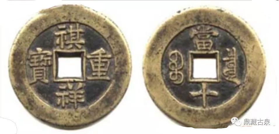 50. 祺祥重宝:铸于清穆宗初登基时(1861年)。时值载垣、肃顺八大臣奉诏辅政,即改元祺祥,并铸祺祥通宝与祺祥重宝当十钱。祺祥是同治皇帝第一个年号,当时提出时即有大臣因“祺”“祥”两字意思相近而持反对意见,后因慈禧太后发动辛酉政变而废止,仅存60天。所铸多为样币,流通币几乎全部收回损毁殆尽。清咸丰十一年七月二十六日鼓铸,还未发行,十月五日即被勒令废除,铸币回炉,堪称中国寿命最短的钱币。祺祥重宝存世罕见,多为母钱、样钱性质,宝泉当十为大珍品,国内无上拍记录。
