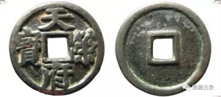 13.天德重宝背殷:五代十国时期南闽政权铸造。公元943年,王审知第三子王延政杀兄自立,称帝于建州,改国号为殷,建元天德,共历2年,铸造有“天德通宝”和“天德重宝”背“殷”钱。根据文献记载,“天德通宝”有铜铁两种,但铜钱仅见数枚,铁钱有折拾型大钱留世。“天德重宝”背“殷”钱也分铜铁两种,其中铜钱有大样和小样之分,面文也有隶书和楷书的区别,有“宝”字“足”部作隶笔,钱币界成为隶宝天德,依据旧谱讲解尚有折拾型【天德重宝背殷】大铜钱传世,极其罕见,惜拓图已残缺。老中国古钱“五十名珍”之一。,2011年嘉德春拍一枚天德重宝背殷,成交价格25.3万元。