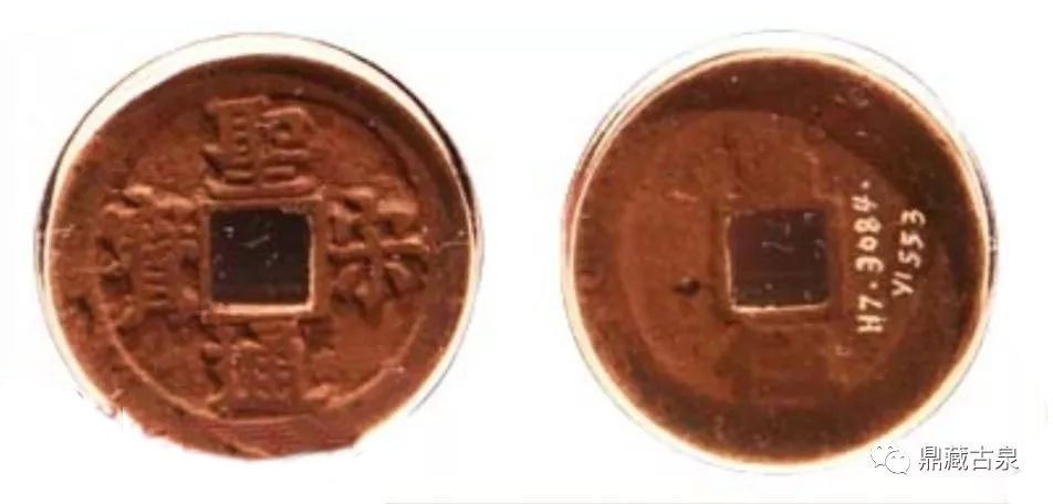 24. 圣宋通宝:宋徽宗赵佶建中靖国(公元1101年)至崇宁(公元1106年)期间铸,非年号钱,有数种版式,均罕见。圣宋通宝分为小平光背、小平型背“当伍”和折二型背“当五”三种,应为试铸性质,存世极稀,居中国古钱珍品之列,近年国内无上拍记录。