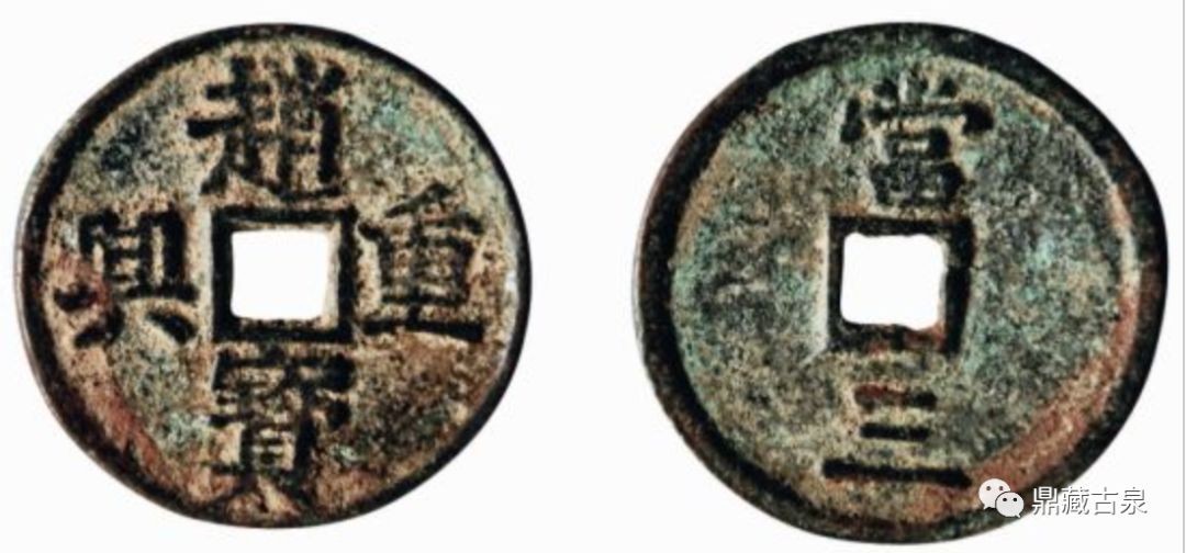 45. 赵宝重兴:相传为南宋末年抗元将领所铸造,具体年代和铸造者已不可考。也有读作“兴赵重宝”的。目前出土仅有两枚,背“当三”,堪称古泉珍。“华光普主编的《中国古钱大集》第827页:“赵宝重兴,传为南宋末年抗元将领所铸,青铜,或读兴赵重宝、赵兴重宝,背文当三。沈子槎旧藏仅见,奇品矣”。国内无拍卖记录。