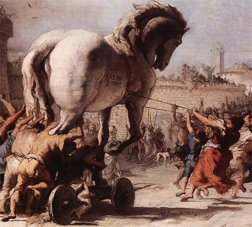 希腊联军在夜晚撤退,并将一支精英小队藏在木马内部。特洛伊人以为木马是希腊联军的投降礼物,将其带入城内。夜深人静时,希腊士兵从木马中爬出,打开城门,引导希腊联军进入特洛伊城。特洛伊人在毫无防备的情况下被希腊军队袭击,城市被征服,特洛伊战争的胜利即将来临。