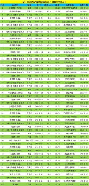 女子百米历史最好成绩Top50(截止2023.7)