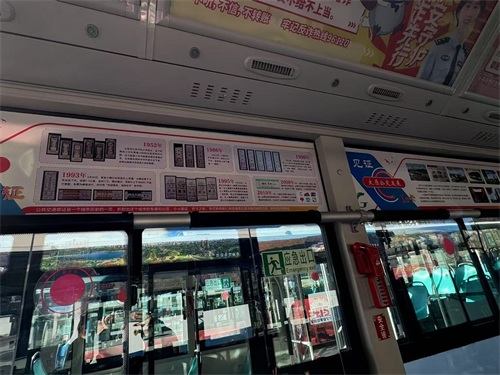 踏入1路车厢,浓厚的历史气息扑面而来,由上客门移步至车厢中部,左右两侧的太原公交发展史如画卷般徐徐展开,置身其中,仿佛穿行在一座流动的公交博物馆。车厢内部“公交历史”模块的内容设置匠心独具,团委工作人员对1路车的发展史和太原公交票证的变迁史等资料进行深度发掘、细心梳理,并将这些内容一一罗列呈现,清晰地勾勒出太原公交发展的脉络与轨迹。