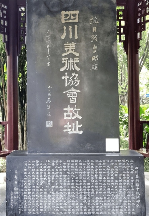“益州称天府,代有才艺出。民初以来,其近代美术亦有长足发展。一九三七年抗日战争爆发后,半壁河山沦入敌手,大批文人志士流寓四川,而美术家则多聚于成都。时蓉城市民敞开胸怀,海纳百川,艺界则团结全国同行,发展民族美术,以共襄抗战救亡为己任,成都原有之蓉社、蜀䉅社、成都美术协会一九四一年合并成立四川美术协会,选址建所于祠堂街少城公园侧,即今人民公园内。由当时协会之常务理事、著名国画家张采芹先生躬亲筹划,奔走运作,次年会所暨展览厅即告建成,而协会会员亦增至二百余人之多。会所的落成与协会的发展,为流寓巴蜀的美术名流和学子举办展览、售画济困创造了条件,同时也大大促进了大后方的美术创作和交流。会所落成后仅一年间,共举办书画展览三十五次,文艺座谈会、演讲会、音乐会、研究会等十余次。抗战烽烟弥漫中,成都的艺术创作与交流竟繁荣如此,堪称中外美术史上之奇观,并备受社会各界之夸赞。美协活动中,特别值得提及的有“张大千临摹敦煌壁画展”“徐悲鸿画展”“抗战建国䉅展”“中国历代古书画展”,以及协助筹资完成“抗日无名英雄铜像”等等。全国各地众多艺苑名作也是首先展示在成都民众面前。四川美术协会的成立及其活动,是抗日战争和中国美术史上光辉的一页,值得成都人民为之骄傲和永远纪念。”