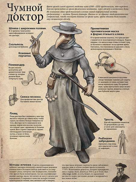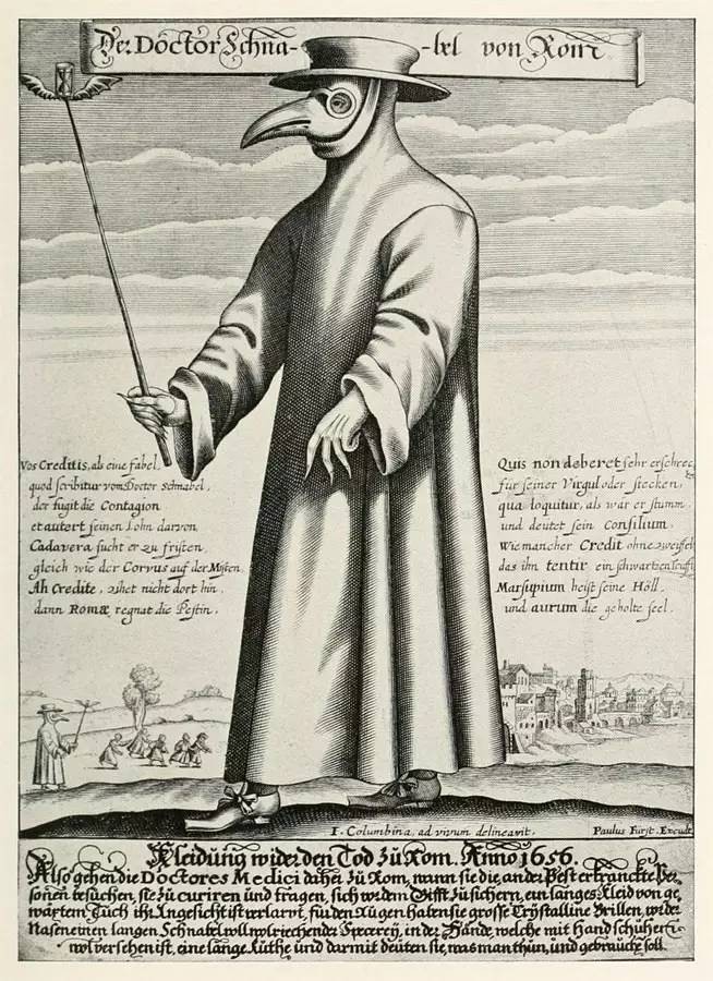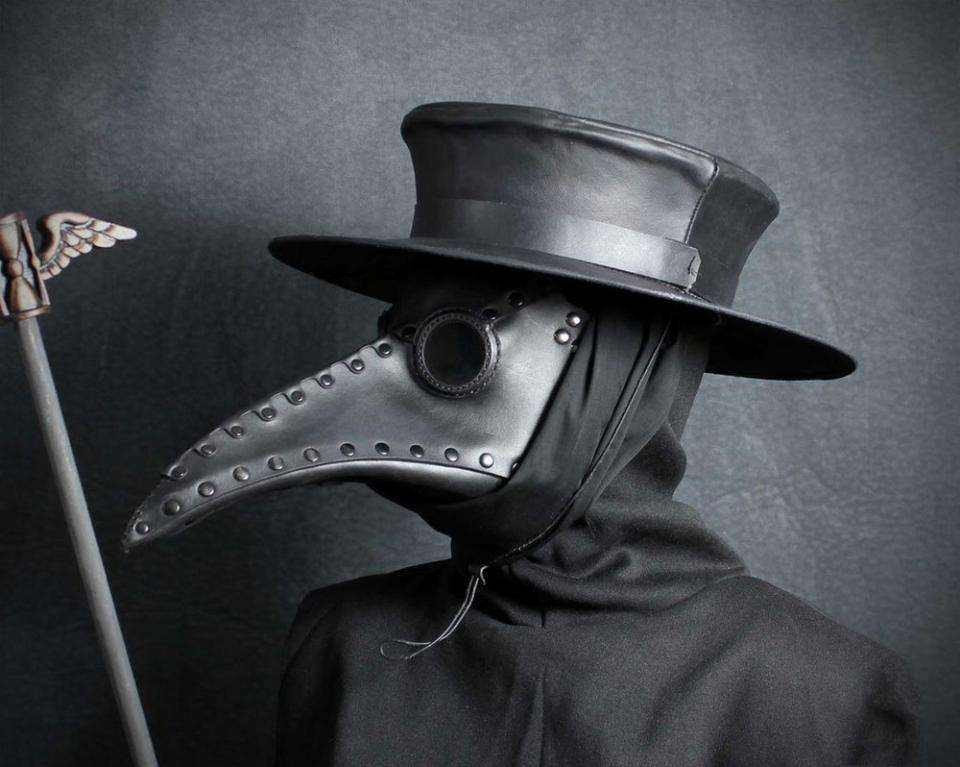 事情发生在中世纪,那时,黑死病横行欧洲,当时的医生为了杜绝感染,身穿泡过蜡的亚麻或帆布衫,头顶戴着黑帽,戴上可过滤空气、状如鸟嘴般的面具,眼睛由透明的玻璃护着,手着手套,持一根木棍,用来掀开病患的被单或衣物,指挥病人如何疗病,他们深深地相信这样的装备可以保护自己免于黑死病的感染。当时的欧洲人心惶惶,隔离、奔逃都没法有效制止疫情,也不明传染源,可能是上帝的惩罚、女巫的杰作或犹太人的伎俩,结果医师折损惨重。