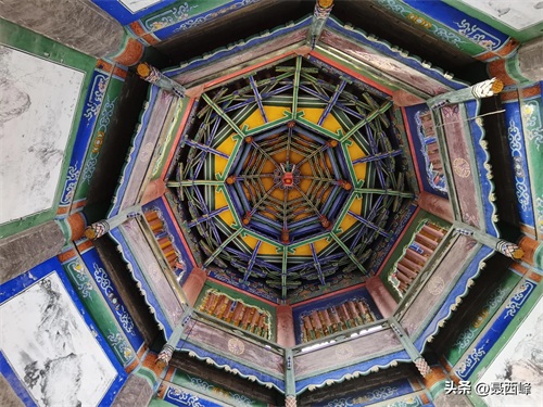 八角亭中心穹顶为龙头含珠,雕花斗拱,重彩琉璃。