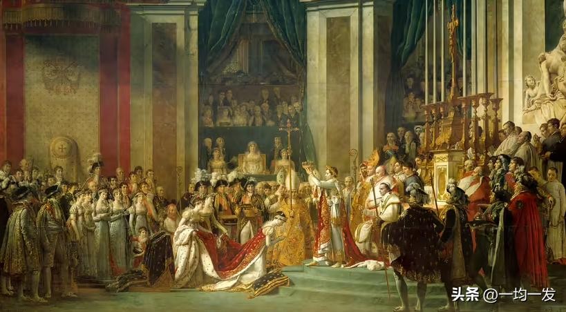 拿破仑在法国大革命期间迅速崛起,通过镇压保王党叛乱和在战场上的卓越表现赢得了声誉,特别是他在意大利和埃及的战役使他声名鹊起。1804年11月6日,经过公民投票,法兰西共和国转变为法兰西帝国,拿破仑正式加冕为皇帝,即拿破仑一世。他的加冕典礼在12月2日举行,一个著名的场景是他从教皇庇护七世手中接过皇冠并自己戴在头上,这一举动象征着他对国家权力的自主控制。拿破仑的统治时期,尽管伴随着连年的战争,但也见证了多项重要改革,包括《拿破仑法典》(Code Napoléon),这是一部对欧洲法律体系影响深远的民法典,它确立了法律面前人人平等的原则,并促进了财产权和契约自由。