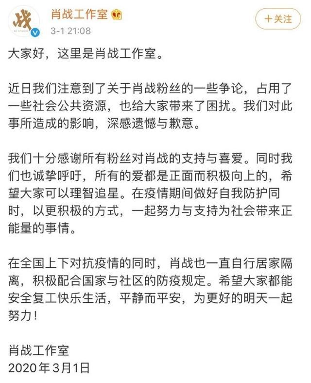 3月1日晚肖战工作室也发布了致歉声明,为粉丝的犯错行为道歉并呼吁粉丝理智追星,以积极的方式为社会带来正能量!同事肖战粉丝也对相关网友做出了道歉。