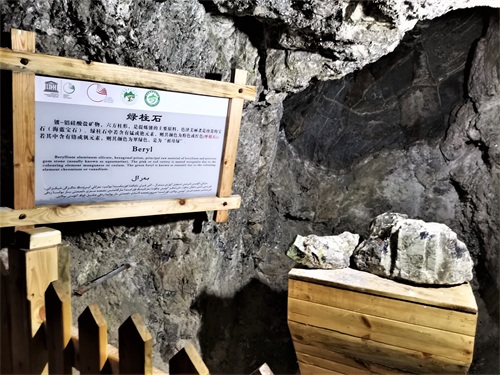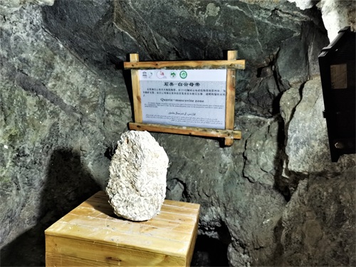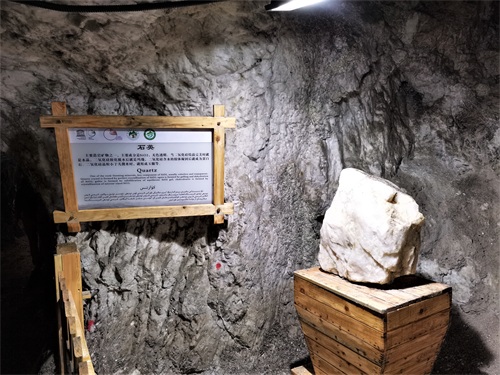 在矿洞两边的洞壁上,距离不远又开凿了一些小洞,里面有标志牌,上面写着每一类矿产的名字和介绍,旁边有一个展柜,上面放置着此类矿石的标本。这些矿石,或者洞壁上的矿元素,可以用肉眼直接看到,有些是亮晶晶的,有些是白色的,还有些是红色、蓝色的等,显得神秘而又珍贵。