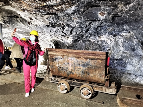 往矿洞里面走,地面坑坑洼洼,有的地方很是宽敞,高度有十几米,宽度达几十米,这里就像一个大厅,显得非常宽敞,只要是安装了设备,还有最初的车轨和装矿石的小车,参观的人纷纷在小车前拍摄留影。