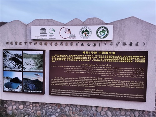 据介绍,可可托海三号矿是伟晶岩脉矿坑,是世界上最大的矿坑,深200米,长250米,宽240米,边壁上的盘山道呈螺旋状,积水漫到矿坑腰部。盛产世界上已知的140多种有用矿物中的86种矿,其中铍资源量居全国首位,铯、锂、钽资源量分别居全国第五、六、九位。其矿种之多,品位之高,储量之丰富,层次之分明,开采规模之大,为国内独有、世界罕见,与世界最著名的加拿大贝尔尼克湖矿齐名,是全球地质界公认的“天然地质博物馆”。