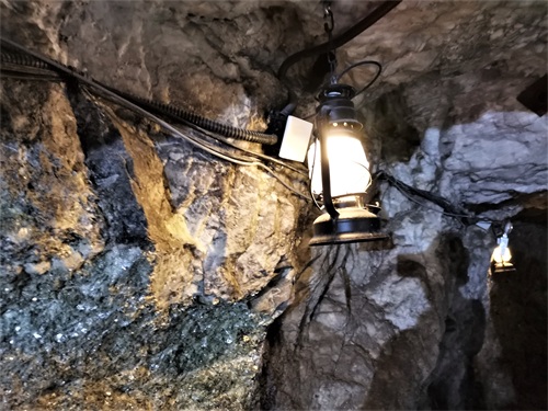 我们在矿洞边戴上安全帽,在导游的带领下,依次进入矿坑。这处矿洞供参观的部分长达800米,其实矿洞的长度远远不止这个数字。进入矿洞,感觉里面较为昏暗,两边的矿壁上挂着马灯,距离不远就有一个,里面装的灯泡,不再是过去的煤油了。从这些马灯,我们能看到建国初期开采矿产的艰辛和不易,那些专家、技术员和工人,在这样恶劣的环境下工作,困难和艰苦,是显而易见的。