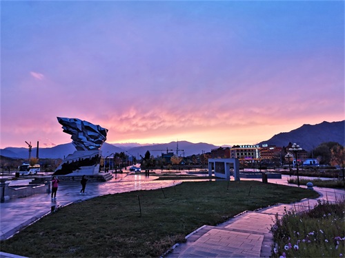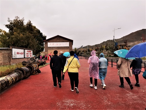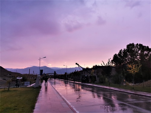 当我们坐区间车回到下面时,天空还飘着小雨,夕阳在西边的天空露出了红色的彩霞,霞光透过阴云,万丈霞光照耀这这片大地,让可可托海三号矿脉变得异常地安详和静谧。这时的可可托海,沉浸在昔日的回忆里,也静静地徜徉在新社会新时代的幸福时光里。