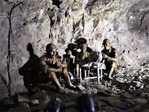 在宽敞的矿洞处,技术人员根据当年的开采场景,制作了矿工的塑像,有的三五人坐在一起吃饭,还有的拿着钢钎在凿矿石,生动再现了当年开矿的艰苦环境和场景。可以想象,上个世纪五六十年代,我国还很落后,但为了国家科技发展和经济振兴,无数的前辈在这里付出了心血和努力,他们用强大的力量支撑和充溢着中国精神,最终才有了我们今天的美好生活。